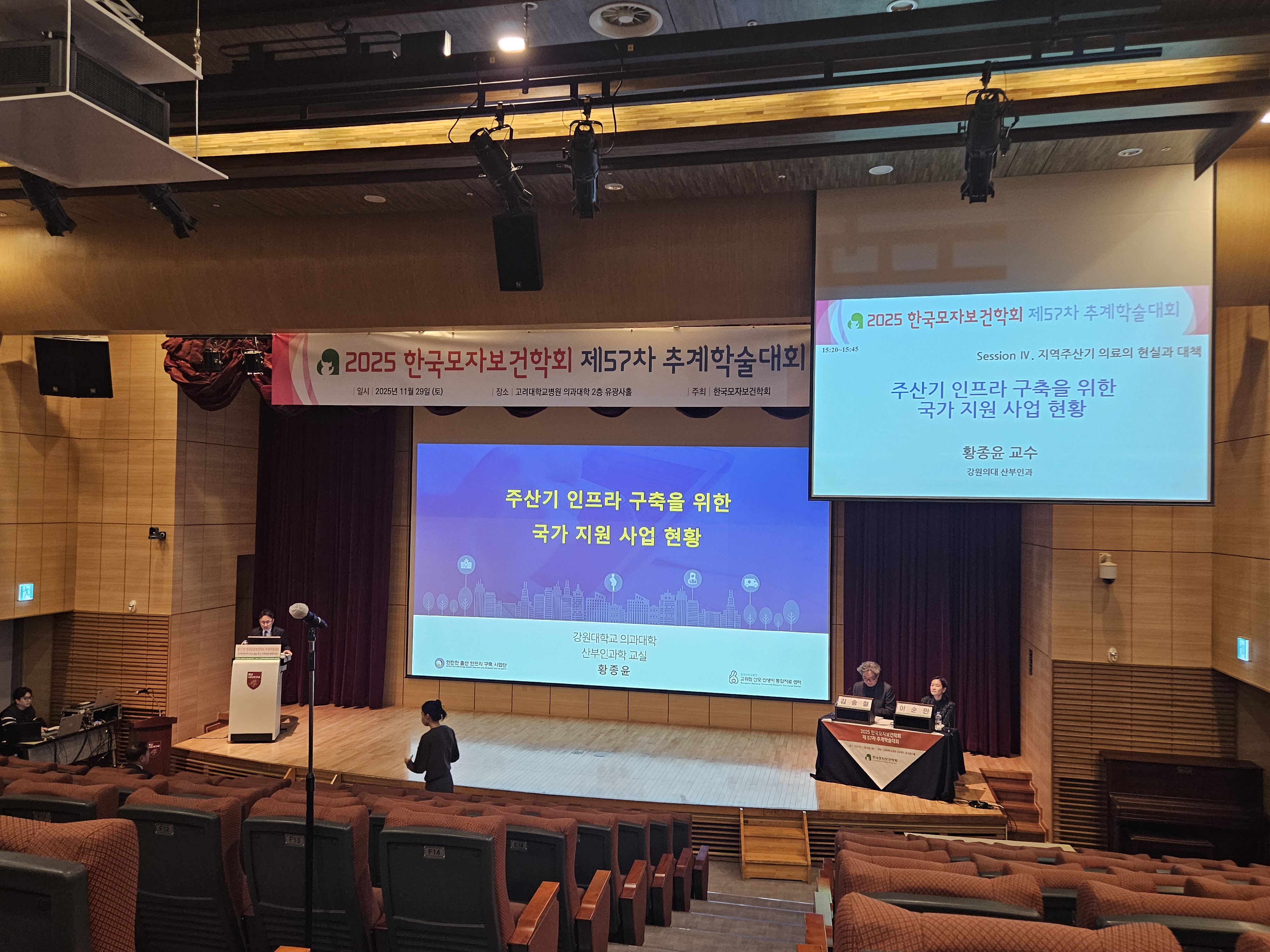 이번에는 주연제가 지난 1년반동안의 의정갈등으로 인한 공백 후 전공의들이 병원에 돌아왔지만 전공의와 전문/전담간호사의 공존현황관련하여 전공의의 주 60시간이하근무 및 48시간이상 근무금지와 맞물려 출산관련 산과 및 신생아분야의 공백의 가속화속에서 전문/전담간호사의 역할이 커지는 상황에서 관련제도 정비, 보상 및 법적보호가 중요 해지겠다는 생각이 들었다. 다음에는 임신중절에 관한 정책연구: 법, 윤리, 의료적관점에 대한 발표의 핵심은 임신중절에 관해 자기결정권 보장과 생명존중에 대한 가치가 대립하는 양상에서 산부인과 입장에서 임신중절의 법적 허용 주수, 약물(미프진 등)에 의한 임신중절에 관한 논란이며 핵심은 출혈 등 안전성이다. 이와 관련하여서는 WHO에서 안내하는 그 사회에서 안전성을 최대한 확보하는 가운데 약물(미프진 등) 임신중절을 허용하는 원칙을 고려한다면 국내에서는 산부인과의사의 관리하에 각 개인에 맞게 약물 및 수술 등의 방법을 적용하는 것이 필요하겠다는 생각이 들었다. 또한 자유연제에는 실험실연구부터 임상연구까지 모자보건분야 다양한 연구가 발표되었다. 나는 순천향대학병원 소아청소년과 이우령교수님과 함께 좌장을 하면 연구 소개 및 QnA를 이끌었다. 이 발표를 통해서 고려의대 구로병원의 설현주교수팀의 연구 “Long-term neurodevelopmental outcomes of twins according to the mode of conception: A nationwide population based study”로 이 연구의 결론은 자연임신으로 된 쌍둥이와 시험관 등 생식보조술로 된 쌍둥이에서 ANO(자폐증, ADHD 등) 발생률에 차이가 없음을 보고하였고 이 연구가 학회 대상으로 마더세이프상을 받게 되었다. 이 연구의 의미는 국내 고령 등으로 인한 생식보조술을 받는 부부 및 가족들이 우려하는 문제를 국내 건강보험공단의 빅데이타를 활용하여 해소하는데 기여한 것이다.